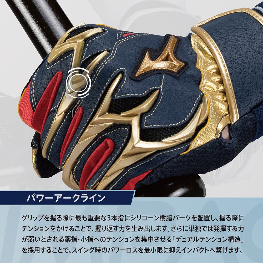 ミズノ独自の指先立体縫製により、指先との密着感が一段とアップ。指の力がスムーズにグリップへと伝わります。
